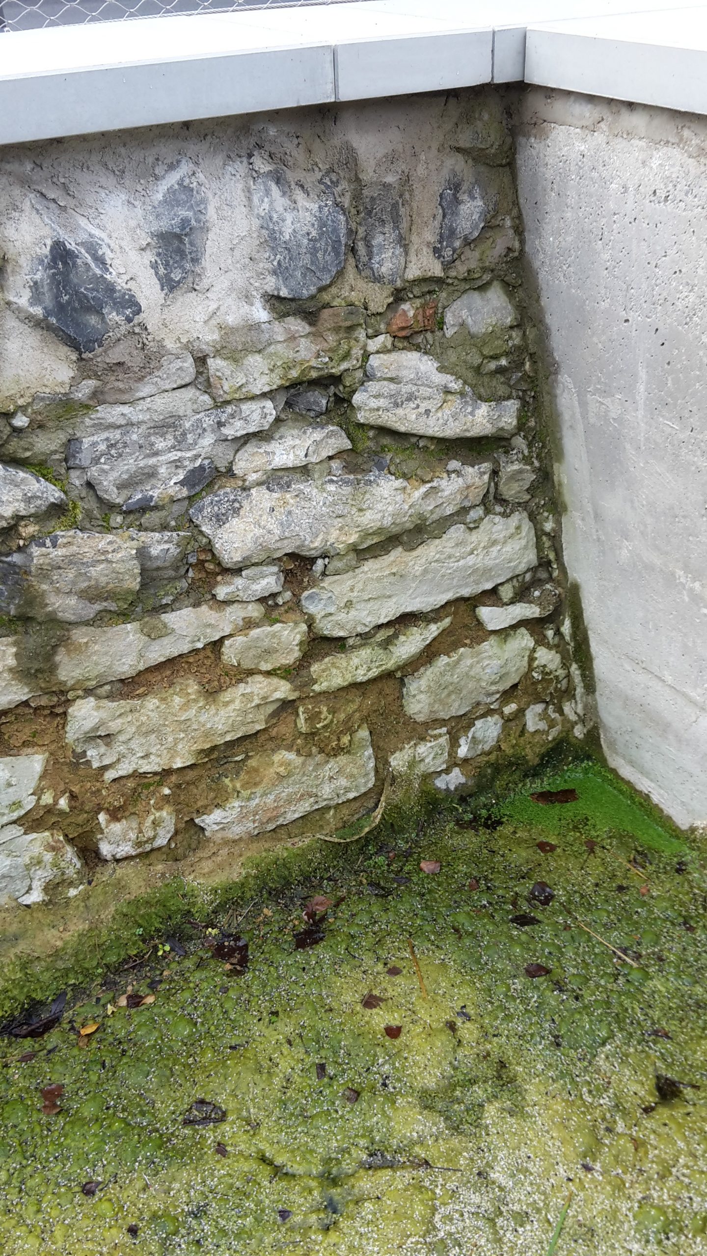 Die Mauerecke im Südwesten direkt neben dem Ab- und Überlauf ist immer vom Erdreich her feucht. Ist hier die undichte Stelle der Weed?