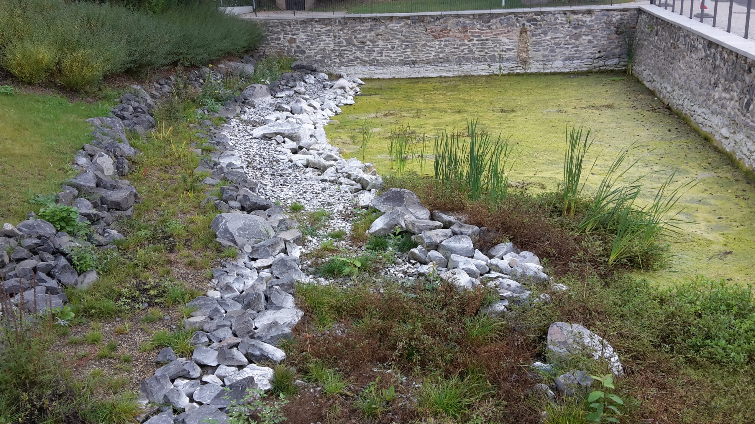 Flachwasserbereich und Sumpfzone stehen im Trockenen. Die bei Starkregen überfluteten Steine haben einen weißen Belag, der auch vom Regen nicht abgewaschen wird.