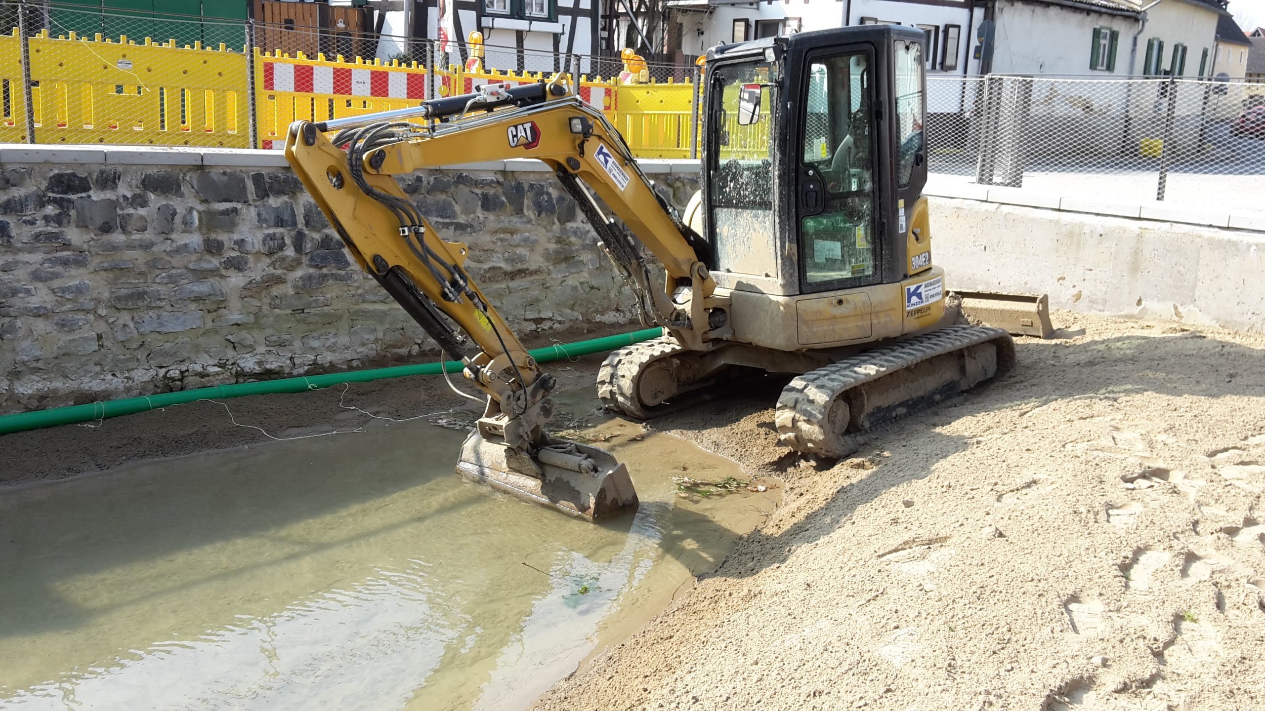 Mit dem Kleinbagger wird der Sand auf der Weedsohle verteilt. (Foto: R. Laasch)
